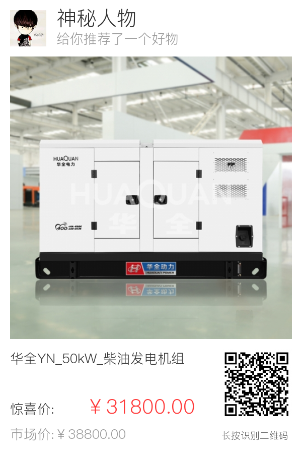 | 1 | 整机 | 出厂标准 | 柴油发电机组 | 华全 | HQ50GF | 华全YN_50kW_柴油发电机组_开架式_普通仪表 | 台 | 1 | ¥31800 | 标准 |