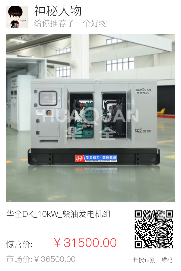 | 1 | 整机 | 出厂标准 | 柴油发电机组 | 华全 | HQ10GF | 华全DK_10kW_柴油发电机组_开架式_普通仪表 | 台 | 1 | ¥31500 | 标准 |