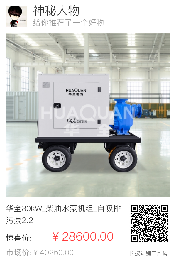 | 1 | 整机 | 出厂标准 | 柴油水泵机组 | 华全 | HQ30WP | 华全30kW_柴油水泵机组_自吸排污泵_拖车防雨棚_普通仪表 | 台 | 1 | ¥28600 | 标准 |