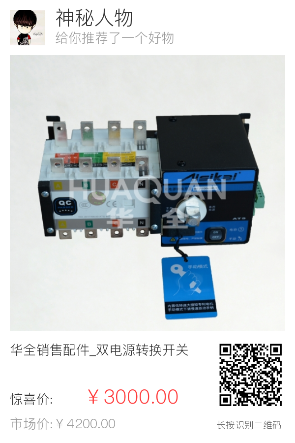 | 1 | 销售配件 | 出厂标准 | 双电源转换开关 | 华全 | SKG | / | 规格太多,无法一一列出,本价格为参考价格,具体价格请咨询客服 (以实际价格为准) | 个 | 1 | ¥3000 |