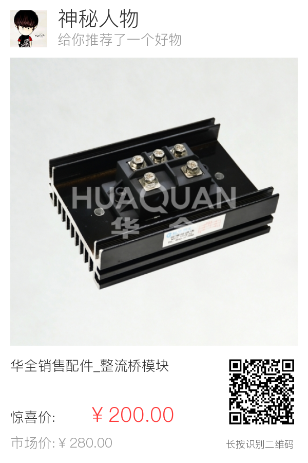 | 1 | 销售配件 | 出厂标准 | 整流桥模块 | 华全 | ZMK1 | / | 型号太多,无法一一列出,本价格为参考价格,具体价格请咨询客服 (以实际价格为准) | 个 | 1 | ¥200 |