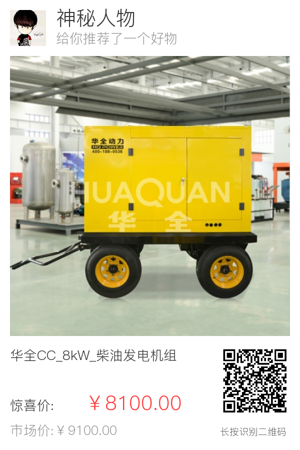 | 1 | 整机 | 出厂标准 | 柴油发电机组 | 华全 | HQ8GF | 华全CC8kW_柴油发电机组_开架式_普通仪表 | 台 | 1 | ¥8100 | 标准 |