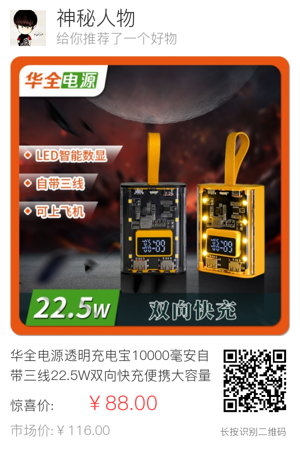 华全电源透明充电宝10000毫安自带三线22.5W双向快充便携大容量