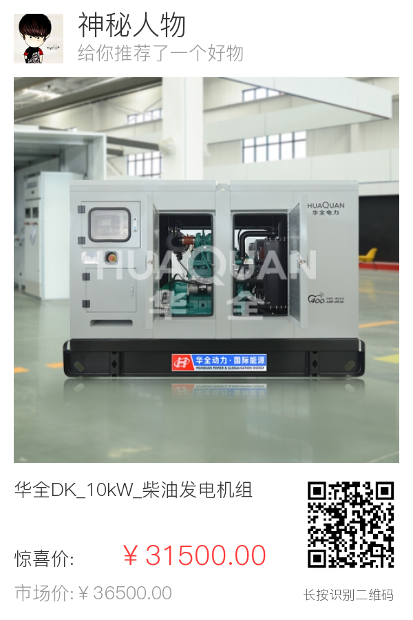 | 1 | 整机 | 出厂标准 | 柴油发电机组 | 华全 | HQ10GF | 华全DK_10kW_柴油发电机组_开架式_普通仪表 | 台 | 1 | ¥31500 | 标准 |