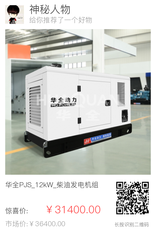 | 1 | 整机 | 出厂标准 | 柴油发电机组 | 华全 | HQ12GF | 华全PJS_12kW_柴油发电机组_开架式_普通仪表 | 台 | 1 | ¥31400 | 标准 |