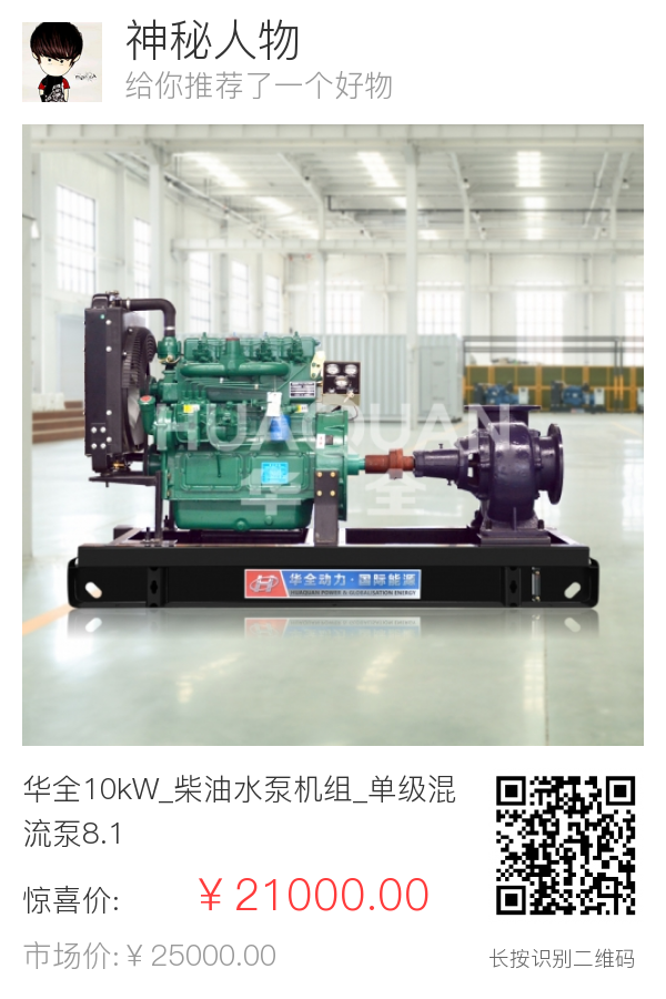 | 1 | 整机 | 出厂标准 | 柴油水泵机组 | 华全 | HQ10WP | 华全10kW_柴油水泵机组_混流泵_拖车防雨棚_普通仪表 | 台 | 1 | ¥21000 | 标准 |