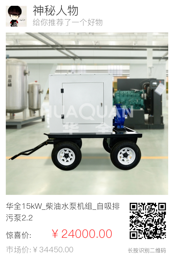 | 1 | 整机 | 出厂标准 | 柴油水泵机组 | 华全 | HQ15WP | 华全15kW_柴油水泵机组_自吸排污泵_拖车防雨棚_普通仪表 | 台 | 1 | ¥24000 | 标准 |