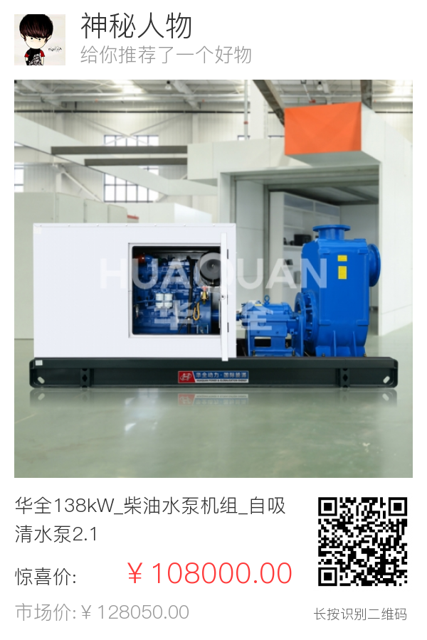 | 1 | 整机 | 出厂标准 | 柴油水泵机组 | 华全 | HQ138WP | 华全138kW_柴油水泵机组_自吸泵_拖车防雨棚_普通仪表 | 台 | 1 | ¥108000 | 标准 |