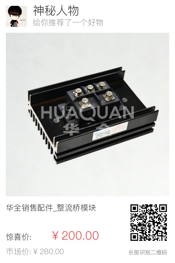 | 1 | 销售配件 | 出厂标准 | 整流桥模块 | 华全 | ZMK1 | / | 型号太多,无法一一列出,本价格为参考价格,具体价格请咨询客服 (以实际价格为准) | 个 | 1 | ¥200 |
